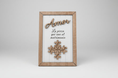 Un cuadro único en madera de 15x20cm que representa el amor como la pieza central que une todas las cualidades de un matrimonio.